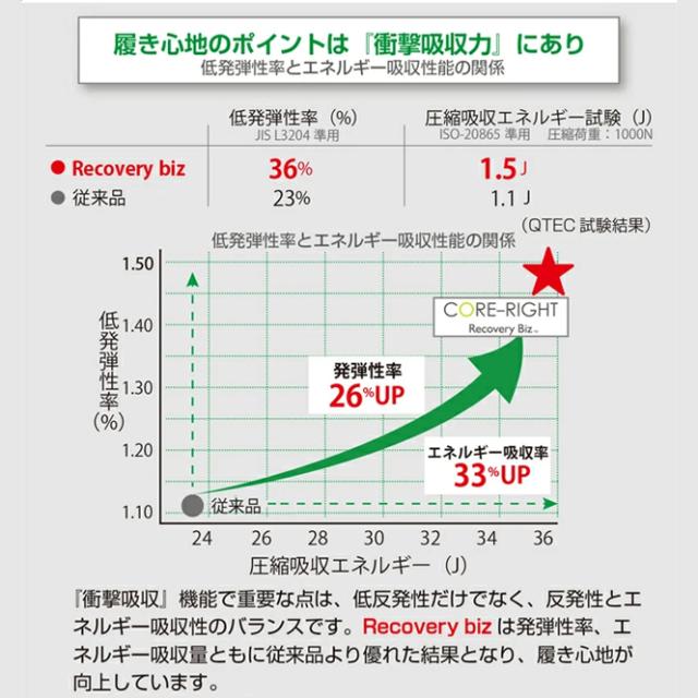 ソフトPUレザーを使用し通気性の良いメッシュライニングとクッション材で快適にフィット。ハニカム構造のインソールが衝撃を分散し歩行に適した最適な硬度のアウトソールとの組み合わせによるWクッション構造が弾むような歩き心地と抜群の屈曲性を生み軽快な蹴り出しをサポート。また従来品と比較して発弾性率26%UP・エネルギー吸収率33%UPという高い衝撃吸収性能(興和インターナショナル社比)を発揮し移動の多い営業職や立ち仕事・外回りの毎日でも足への負担をしっかり軽減してくれる高機能ビジネスシューズです。