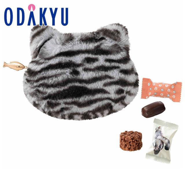 サバトラ猫をイメージしたポーチに2種類のチョコレート菓子を詰め合わせたにゃ。