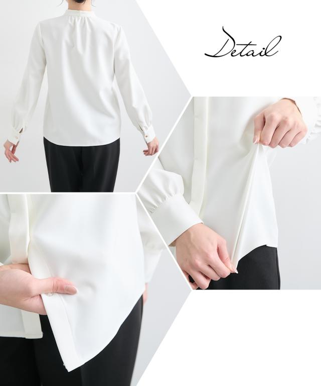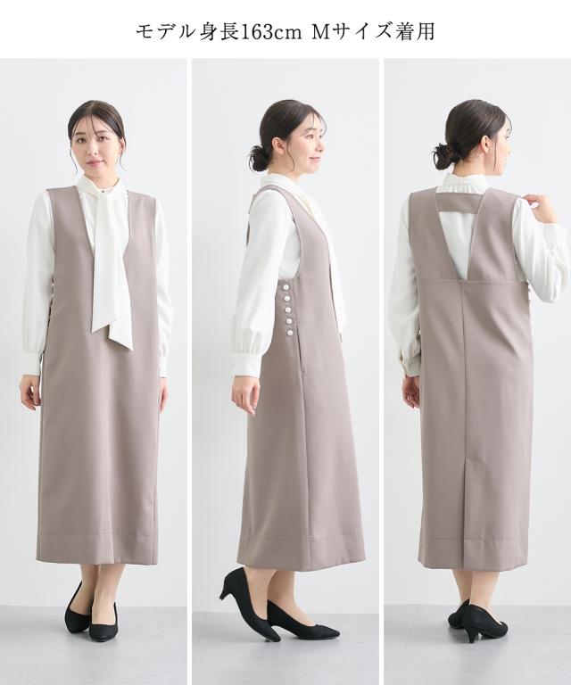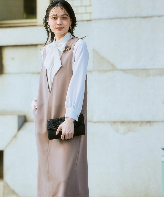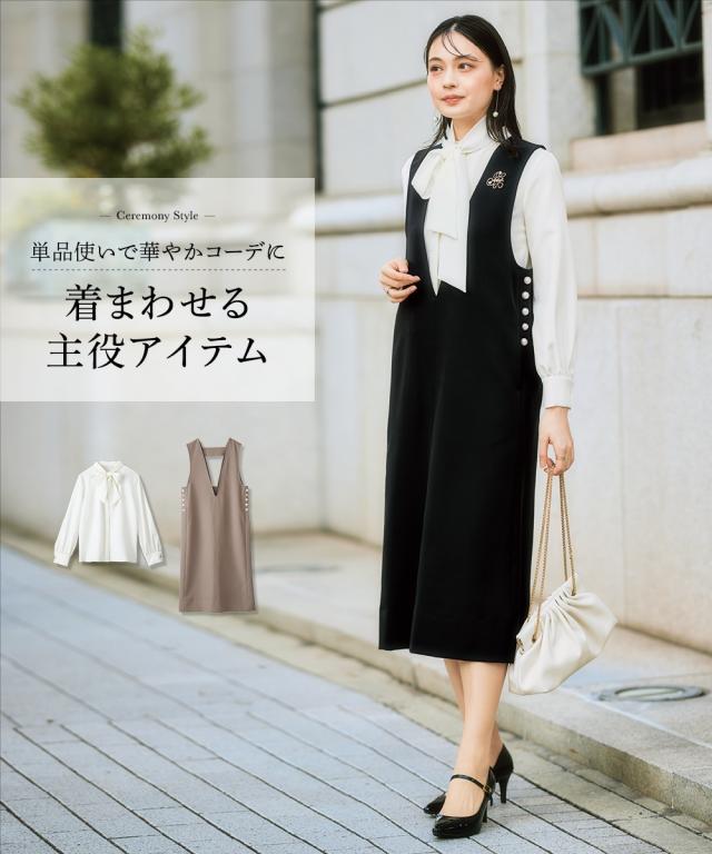 <好印象> 格式高い上品な装いを、大切にされる方へ ハレの日を彩るセレモニースタイル こだわりポイント 今しかない特別な時に寄り添うこだわりの一枚 様々なシーンで着回せる新しいセレモニースタイルを提案 サイドパール調ボタンジャンスカとボウタイリボンブラウスの組み合わせが絶妙なセットアップ ジャンスカのサイドには、華やかさを演出してくれるパール調ボタンをプラス すっきりした抜け感のあるVネックで、スタイリッシュな印象に 取り外しできるボウタイリボンで着こなし自由に変化 ボウタイリボンは太めにすることで、結ぶときにボリューム感を出すことができ、華やかさを演習 ジャンスカ・ブラウスには、ストレッチ生地を使用 着心地ラクチン・式典時の窮屈さを抑えた設計に 肉厚の生地を使用しているので、しっかりハリ感があり、上品な装いを演出 シーンに合わせて自分にしかない美しさを演出してくれます。 ジャンスカ・ブラウスともに、お手持ちのアイテムで、様々なシーンで着回しでき、カジュアルからきれいめコーデが完成 通勤やオフィスコーデまでカバーできます 特別な日を華やかに美しく装う 汎用性にこだわったセットアップです。 体型カバーポイント 気になる二の腕をお