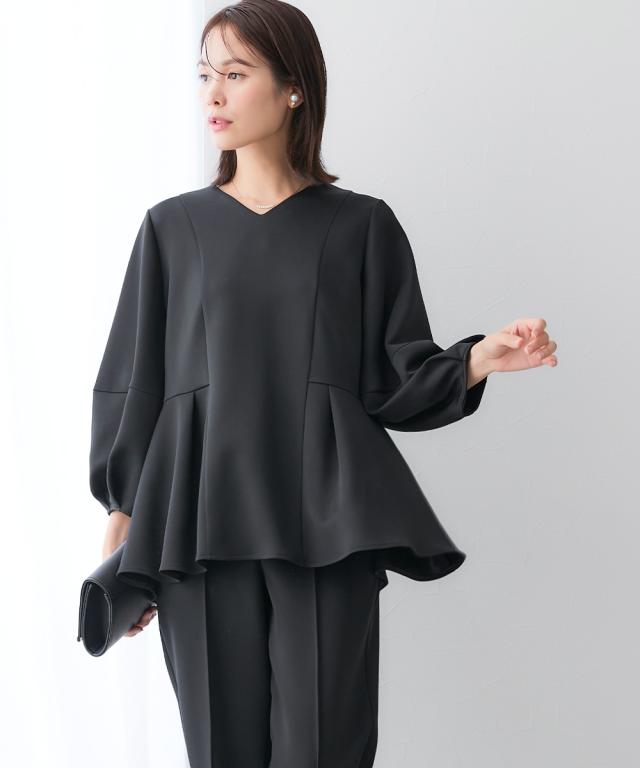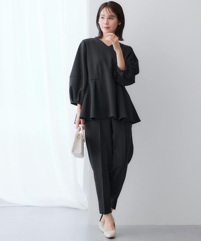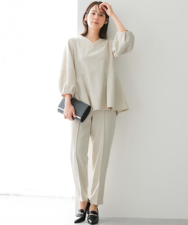 【レディーススーツ】ダンボールニット素材ブラウスセットアップスーツ(9分袖ブラウス+テーパードパンツ)