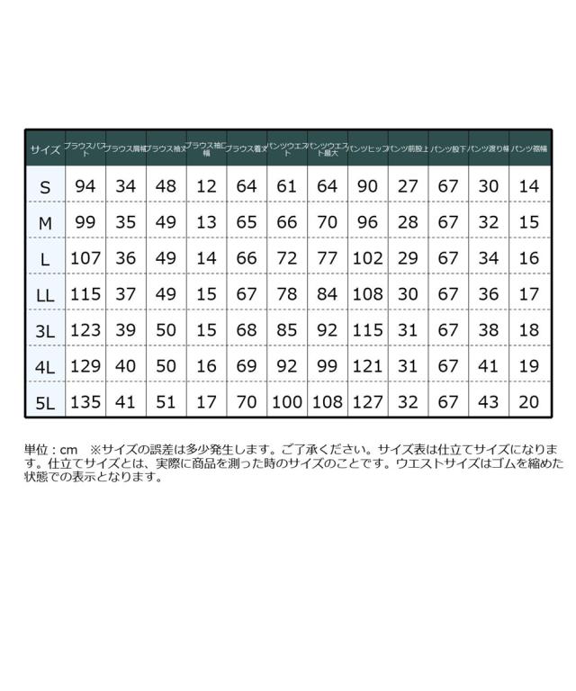 品質=ポリエステル95%・ポリウレタン5% 裏地無ブラウス:後涙開パンツ:前ホック付ファスナー開 ウエスト後ゴム入 ポケット両脇※この商品は2点同サイズのみで販売します。 原産国:中国製 備考:洗濯機OK ネット使用 単位:cm ※サイズの誤差は多少発生します。ご了承ください。サイズ表は仕立てサイズになります。仕立てサイズとは、実際に商品を測った時のサイズのことです。ウエストサイズはゴムを縮めた状態での表示となります。