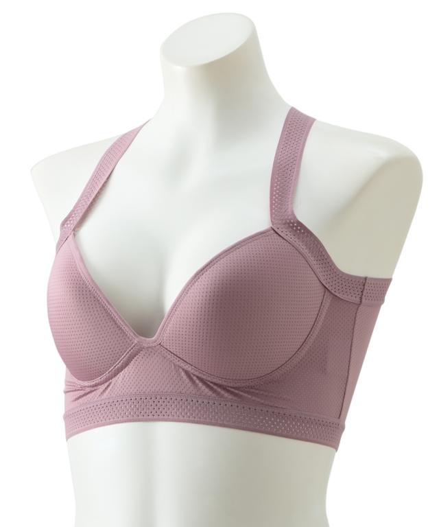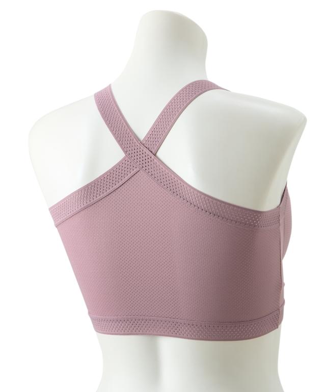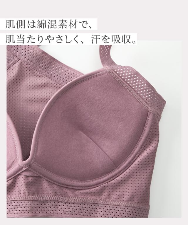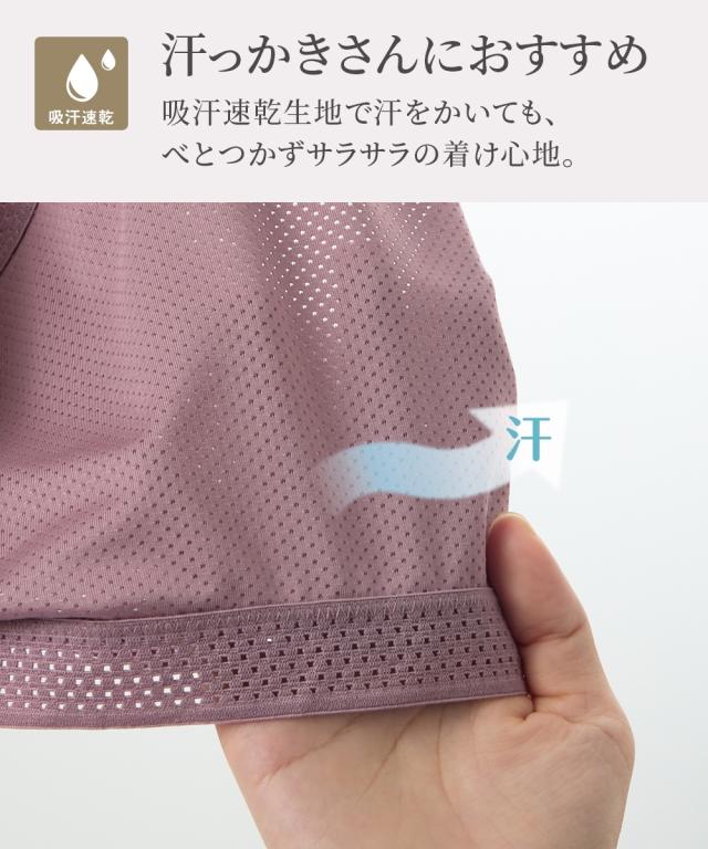 汗っかきさんにおすすめ!本体素材は通気性のよいメッシュ生地で日中はしっかり汗を吸って、お洗濯後は早く乾く【吸汗速乾機能】付きの生地を使用。タテヨコに伸縮する素材はゆるすぎず身体にぴたっとフィット。 カップはアウターに響きにくいシームレスカップで上に着るものも選ばないのでデイリー使いに最適。 カップ部肌側は、綿混生地を使用。肌にやさしい肌触りで汗流れも感じにくい。ストラップ部はストレッチゴムを使用。背中がクロス仕様で肩ひもがズレ落ちにくい。肩回りの圧迫感も少なく腕の動きも妨げないのでストレッチなどの軽い運動にも着用できます。 ワイヤーがなく、小さくたためるので持ち運びが簡単で汗かく季節の着替えや旅行の荷物がコンパクトになります。