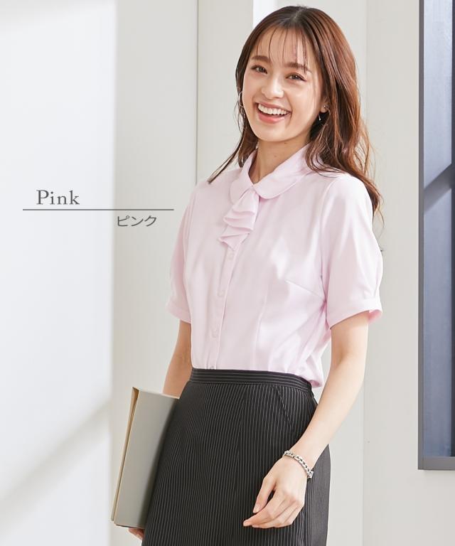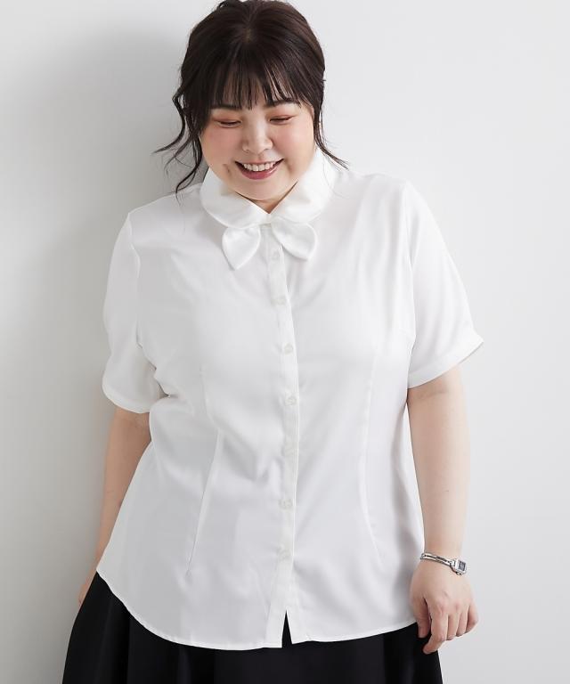 事務服 ブラウス シャツ レディース 会社制服 半袖 パウダーサテン 帯電防止 抗菌防臭 加工 リボンタイ フリルタイ付 スーツインナー | LL/3L | ニッセン nissen