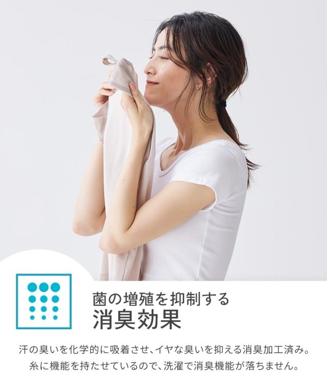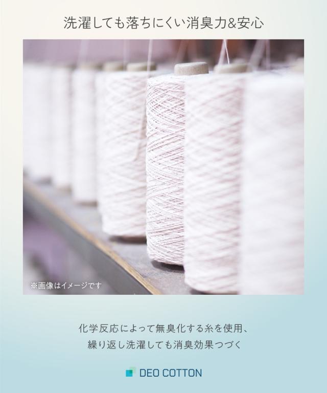 綿100%なのに消臭する 「着るだけデオドラント」DEOコットン 原綿の段階で改質を行い、綿繊維自体に消臭因子を持たせた糸を紡績することで、 綿100%なのに消臭するインナーが実現しました。 ふとした時に気になる汗のニオイ・・・ インナーは肌に優しい素材がいい・・・ どちらのお悩みにも応えるインナーです。 【機能】 ・消臭 着ている間、イヤな汗のニオイを消臭。 改質し、消臭因子を持った原綿を紡績した糸を使用しているので、洗濯しても効果が続く。 ・抗菌防臭 菌の増殖を抑えてイヤなニオイを予防。 汗ばむ季節にピッタリ。