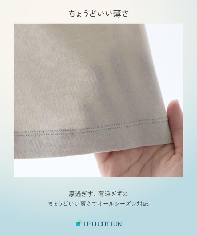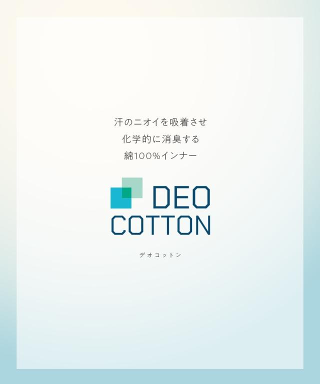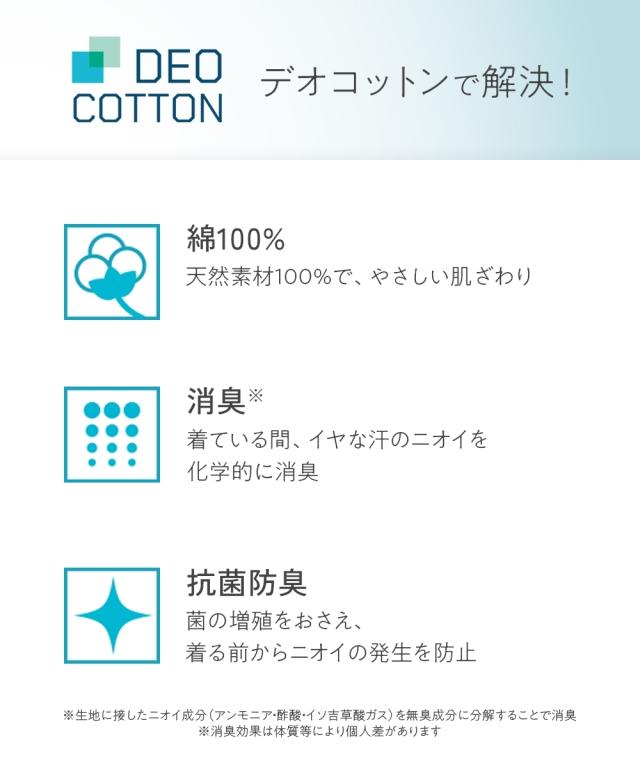 綿100%なのに消臭する 「着るだけデオドラント」DEOコットン 原綿の段階で改質を行い、綿繊維自体に消臭因子を持たせた糸を紡績することで、 綿100%なのに消臭するインナーが実現しました。 ふとした時に気になる汗のニオイ・・・ インナーは肌に優しい素材がいい・・・ どちらのお悩みにも応えるインナーです。 【機能】 ・消臭 着ている間、イヤな汗のニオイを消臭。 改質し、消臭因子を持った原綿を紡績した糸を使用しているので、洗濯しても効果が続く。 ・抗菌防臭 菌の増殖を抑えてイヤなニオイを予防。 汗ばむ季節にピッタリ。