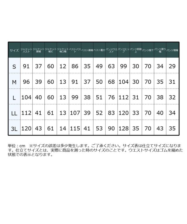 品質=ポリエステル100%[裏地]有(ジャケット:背抜き ベスト:総裏)パンツ無ジャケット:肩パッド有(取外し不可) 前ボタン開 袖口スリット ポケット両脇・左内 後ベンツ ベスト:前ボタン開 ポケット両脇・左胸パンツ:前ホック内ボタン付ファスナー開 ウエスト両脇ゴム入 ポケット両脇・後飾り※この商品は3点同サイズのみで販売します。 原産国:中国製 備考:洗濯機OK ネット使用 単位:cm ※サイズの誤差は多少発生します。ご了承ください。サイズ表は仕立てサイズになります。仕立てサイズとは、実際に商品を測った時のサイズのことです。ウエストサイズはゴムを縮めた状態での表示となります。