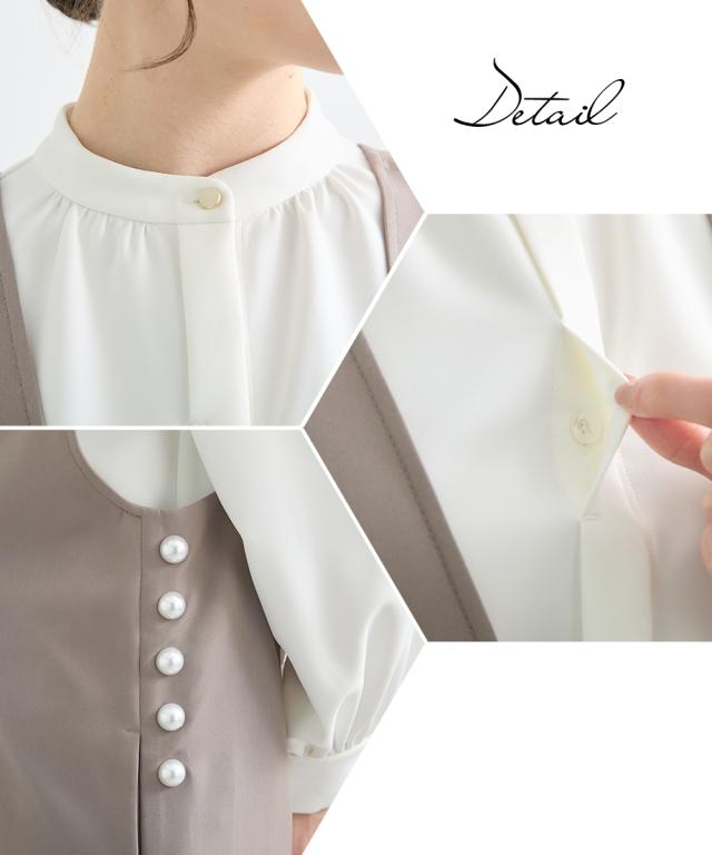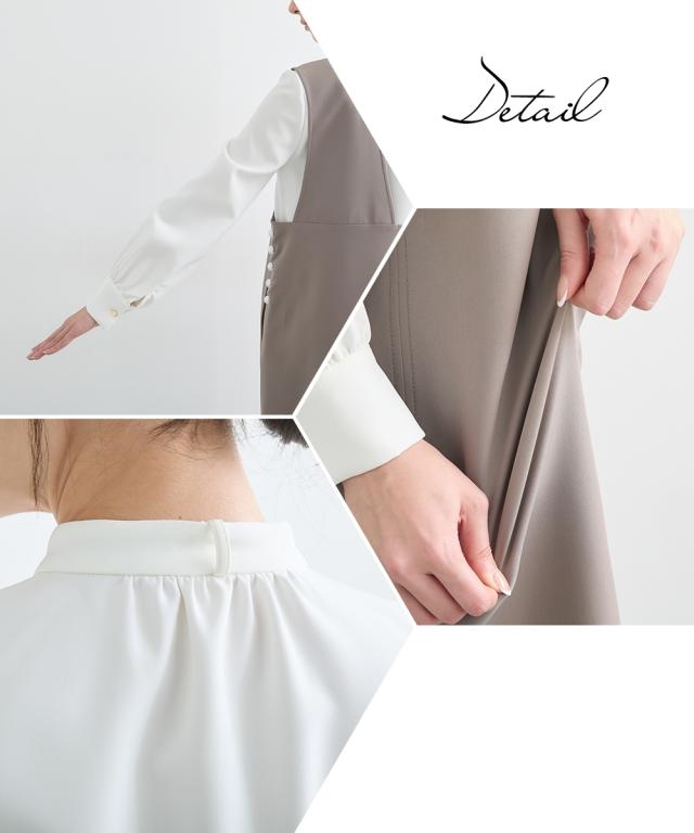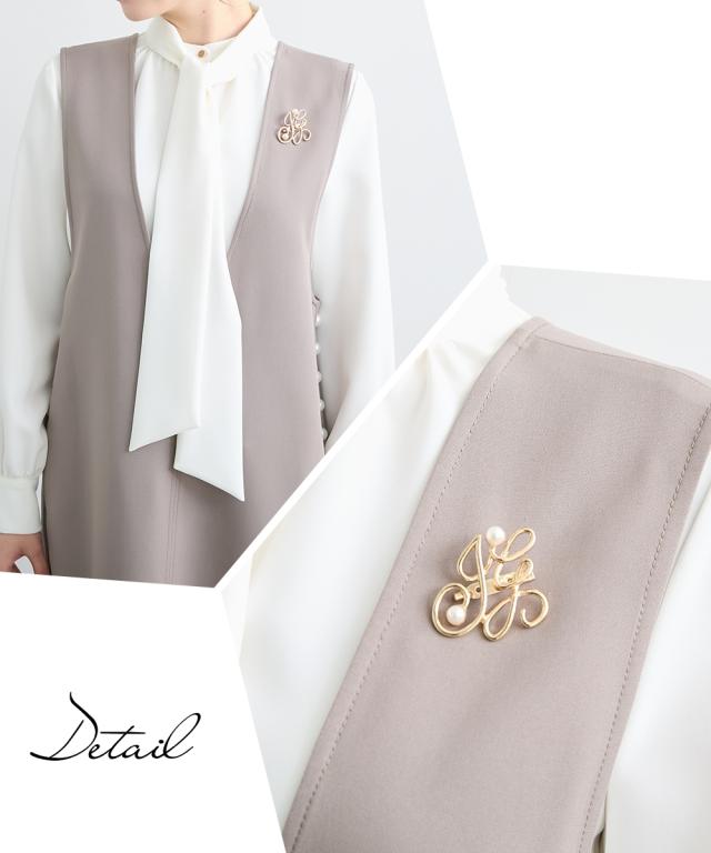 <好印象> 格式高い上品な装いを、大切にされる方へ ハレの日を彩るセレモニースタイル こだわりポイント 今しかない特別な時に寄り添うこだわりの一枚 様々なシーンで着回せる新しいセレモニースタイルを提案 サイドパール調ボタンジャンスカとボウタイリボンブラウスの組み合わせが絶妙なセットアップ ジャンスカのサイドには、華やかさを演出してくれるパール調ボタンをプラス すっきりした抜け感のあるVネックで、スタイリッシュな印象に 取り外しできるボウタイリボンで着こなし自由に変化 ボウタイリボンは太めにすることで、結ぶときにボリューム感を出すことができ、華やかさを演習 ジャンスカ・ブラウスには、ストレッチ生地を使用 着心地ラクチン・式典時の窮屈さを抑えた設計に 肉厚の生地を使用しているので、しっかりハリ感があり、上品な装いを演出 シーンに合わせて自分にしかない美しさを演出してくれます。 ジャンスカ・ブラウスともに、お手持ちのアイテムで、様々なシーンで着回しでき、カジュアルからきれいめコーデが完成 通勤やオフィスコーデまでカバーできます 特別な日を華やかに美しく装う 汎用性にこだわったセットアップです。 体型カバーポイント 気になる二の腕をお