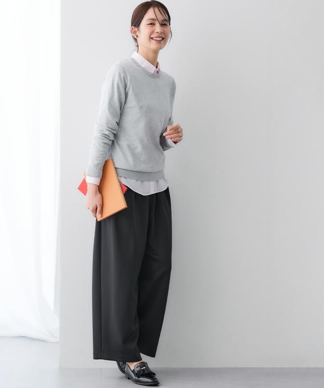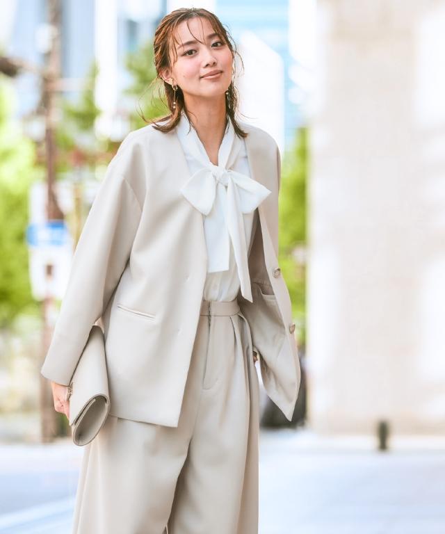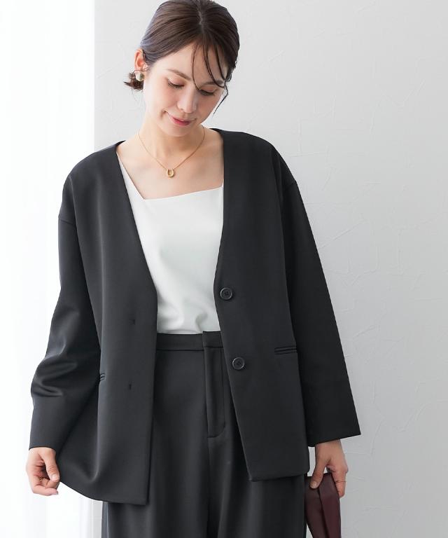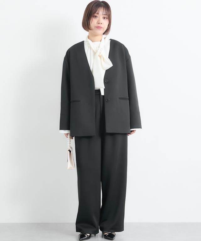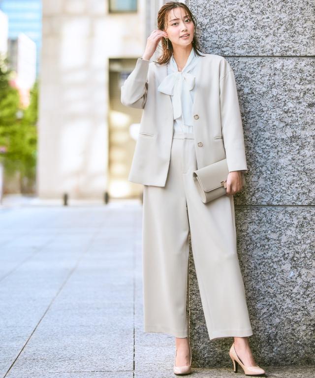 スーツ レディース ダンボール ニット 素材ノーカラー ジャケット +ワイド パンツ 春 秋 ビジネス セットアップ | S/M/L | ニッセン nissen
