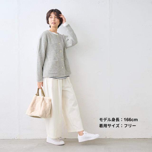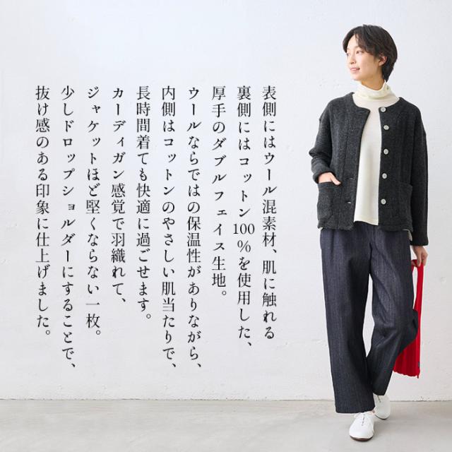厚手のウールコットン素材を使用した、ダブルフェイス仕立てのライトジャケット。表側はウール混素材であたたかく、裏側はコットン100%のやさしい肌触りで、秋冬シーズンも快適に着用できます。ウールの保温性がありながら重たくなりすぎず、長時間羽織っても心地よい着心地です。カーディガン感覚で気軽に羽織れるデザインで、ジャケットほど堅くならない程よいきちんと感。少しドロップショルダーのゆったりシルエットが体のラインを拾いにくく、通勤・お出かけ・日常使いまで幅広く活躍します。