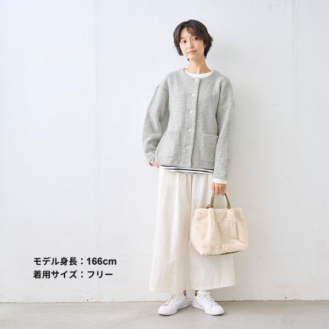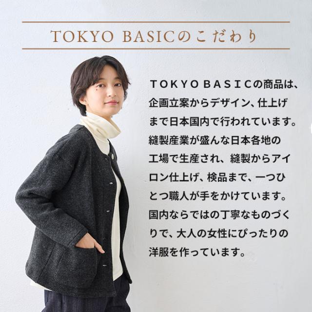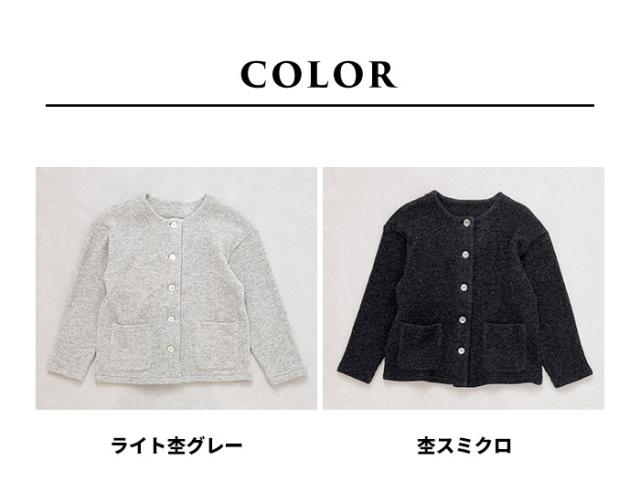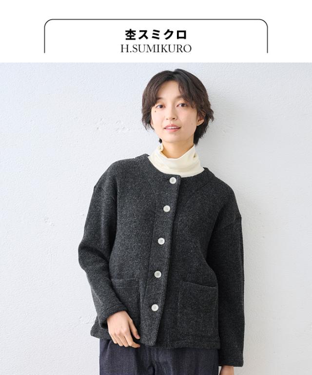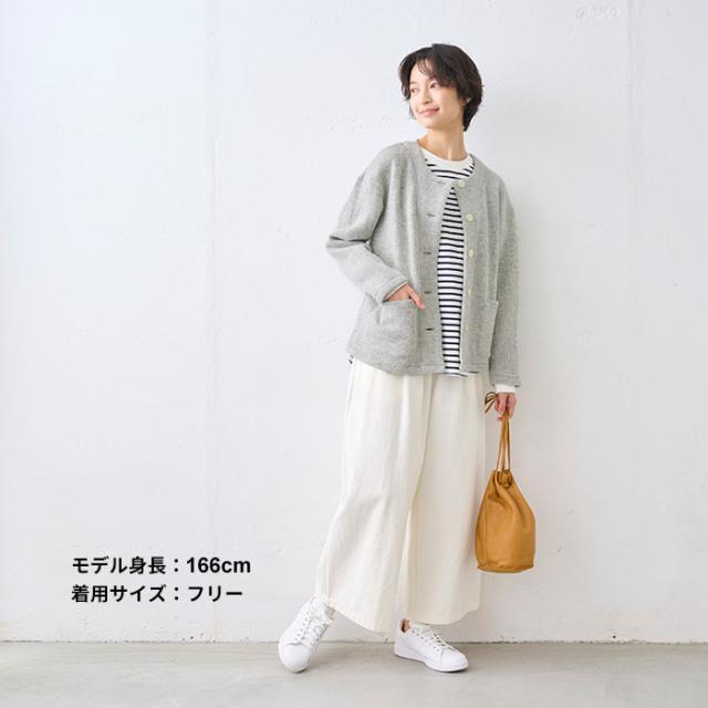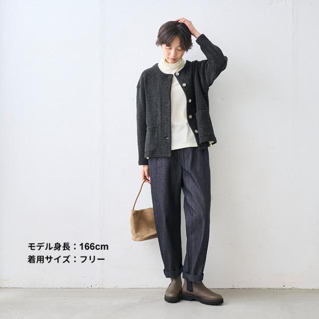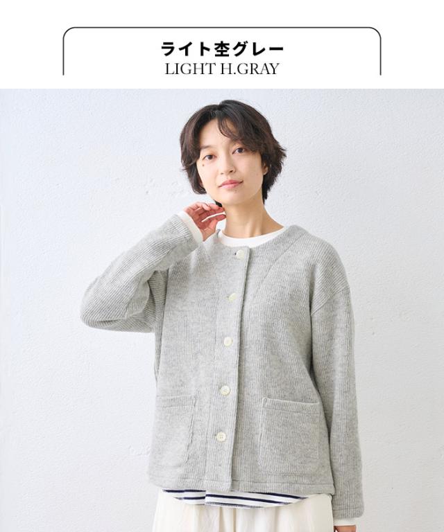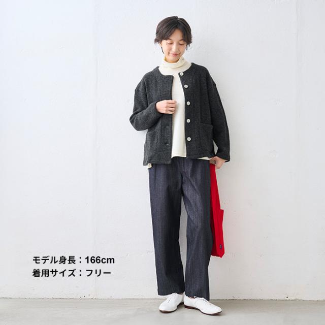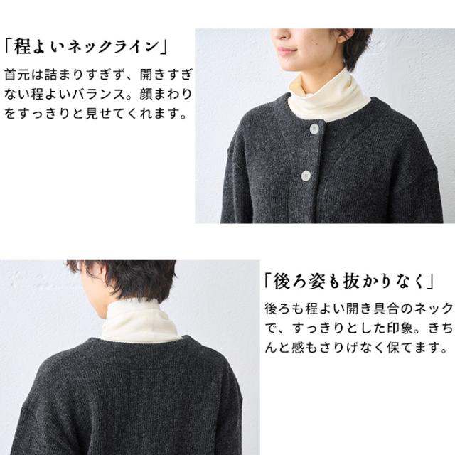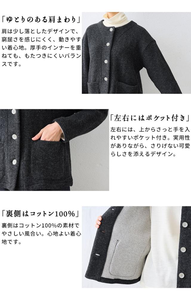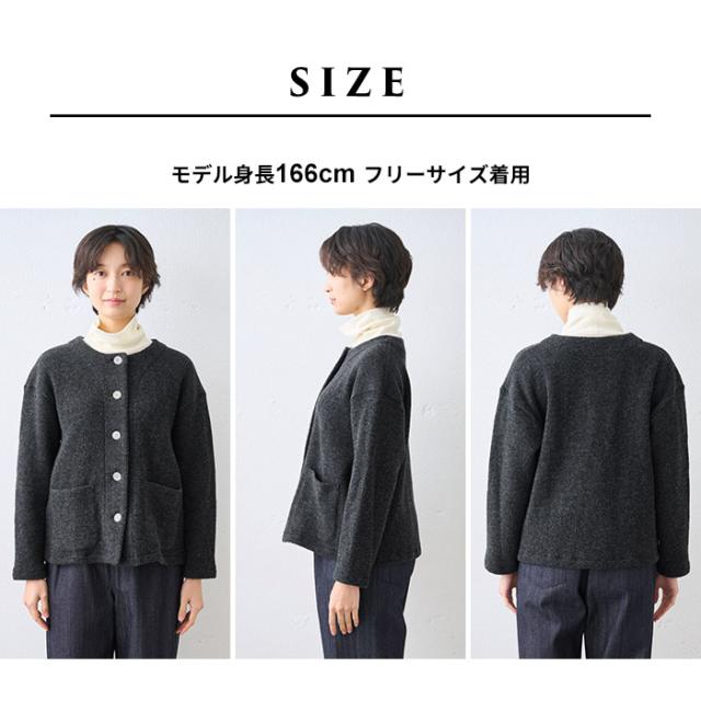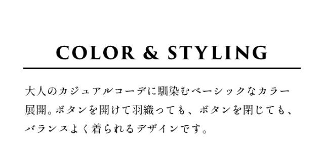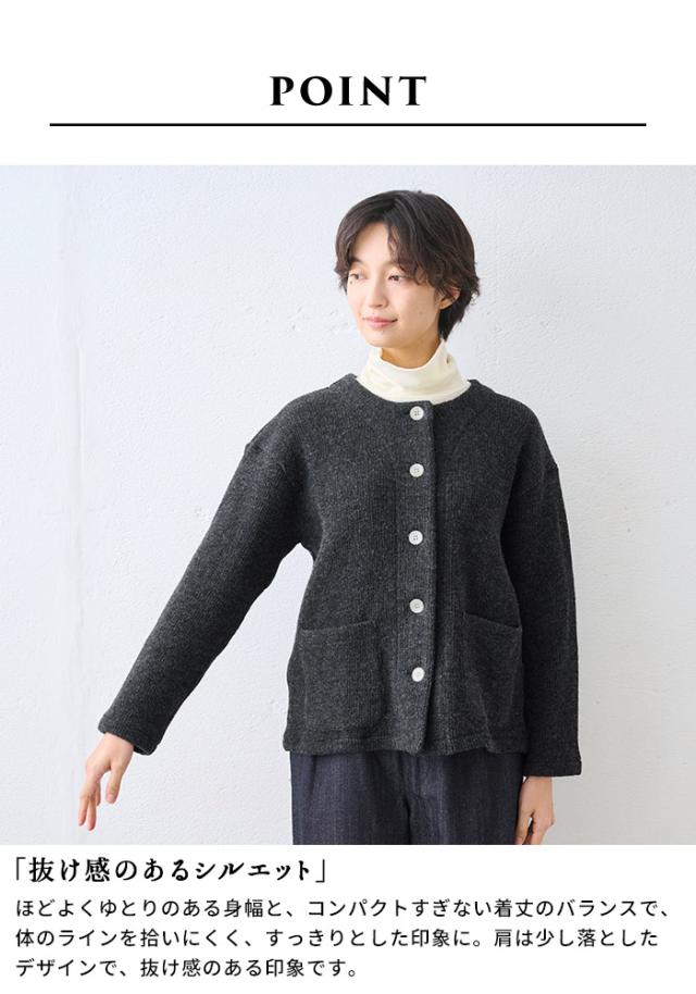 特徴 表側にはウール混素材、肌に触れる裏側にはコットン %を使用した、厚手のダブルフェイス生地。ウールならではの保温性がありながら、内側はコットンのやさしい肌当たりで、長時間着ても快適に過ごせます。カーディガン感覚で羽織れて、ジャケットほど堅くならない一枚。少しドロップショルダーにすることで、抜け感のある印象に仕上げました。