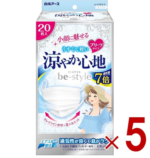 白元アース ビースタイル プリーツタイプ 涼やか心地 20枚入 ホワイト 女性用マスク 5個