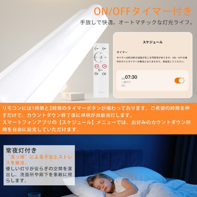 - 定時で照明のオン・オフを設定でき、自然の日の出や日の入りをシミュレーションします。リモコンで1時間または2時間のタイマー設定ができ、スマートフォンはアラームのように自由にタイマーを設定できます。