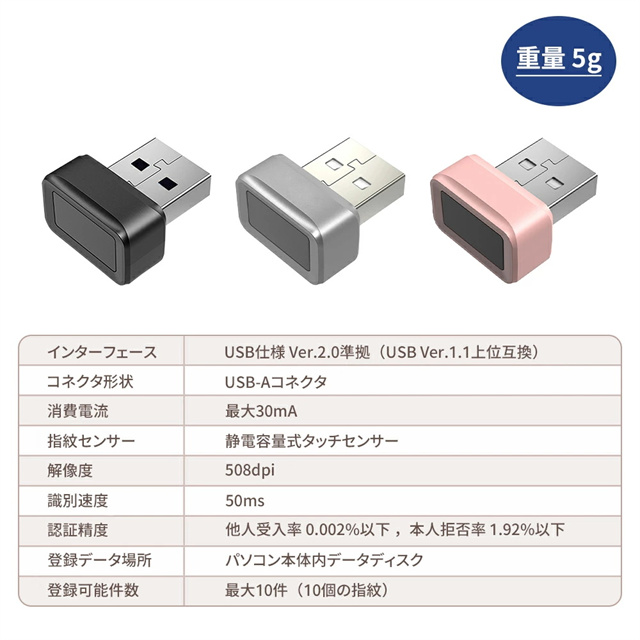 | 仕様 | ◆インターフェース:USB仕様Ver.2.0準処(USB Ver.1.1上位互換) ◆コネクタ形状:USB-Aコネクタ ◆消費電流:30mA ◆指紋センサー:静電容量式タッチセンサー ◆解像度:508dpi ◆識別速度:50ms ◆認証精度:他人受入率0.002%以下、本人拒否率1.92%以下 ◆登録データ場所:パソコン本体内データディスク ◆登録可能件数:最大10件(10個の指紋) |