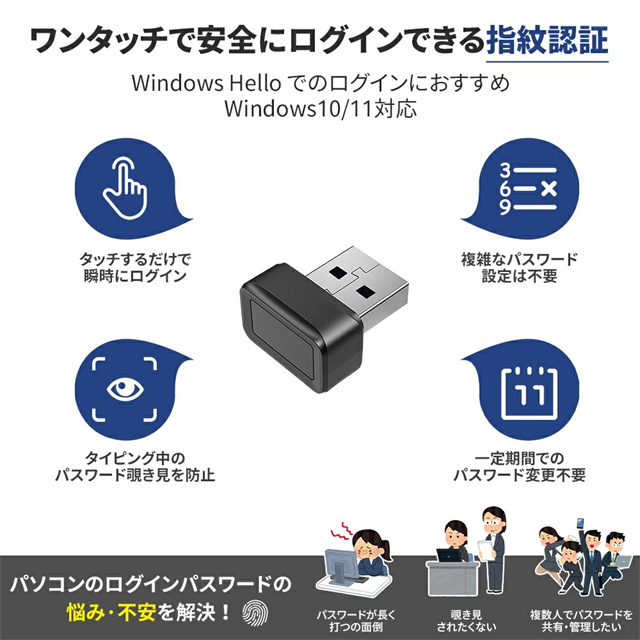 パソコン用 指紋認証リーダー USB接続 生体認証 USB パソコン PC用 指紋 指紋センサー Windows Hello Windows10 11対応 指紋最大10件登録 情報漏洩対策