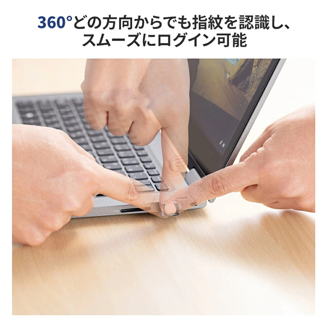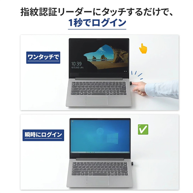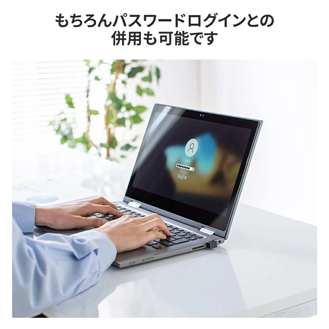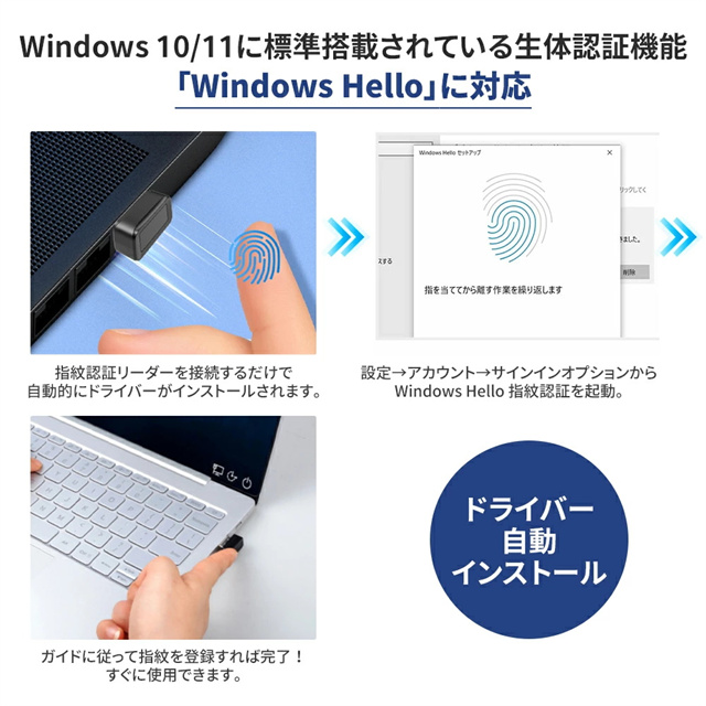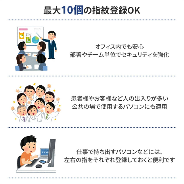 | 特徴 | パソコン用のUSB接続の外付け指紋認証リーダー です。パソコンの不正使用、 個人情報・データの盗難などから守ります。 Windows 11・10搭載の生体認証機能「 Windows Hello 」で指紋認証ログインすることができます。「 Windows Hello 」は最大10件の指紋を登録できます。 Windows専用ドライバーで接続するだけの簡単設定です。パソコンの立ち上げ時に指紋認証ログインが可能になります。正面からの指紋認証だけでなく、360°どの角度からも指紋を読み取ることができます。 サインイン画面の「サインインオプション」から キーボード入力での ログイン も可能なので、 指紋認証と並行してPINコードも運用できます。 |