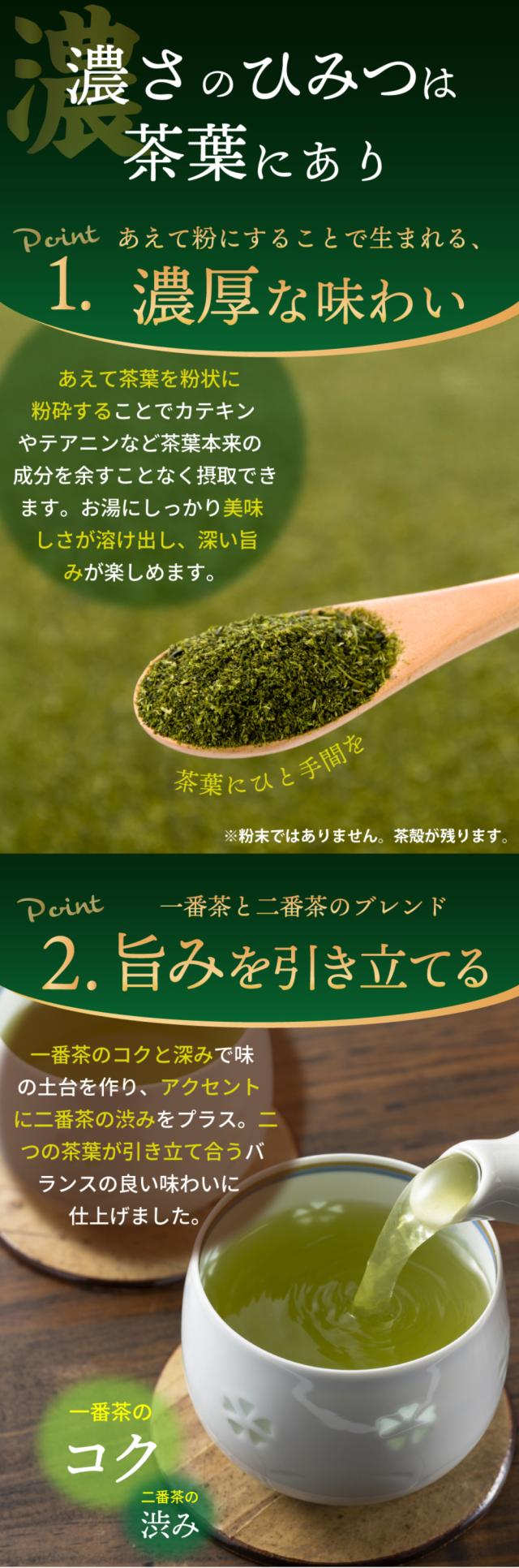 一般的な煎茶(茶葉の抽出液)に対し深むし製法では茶葉そのものが溶け出します。