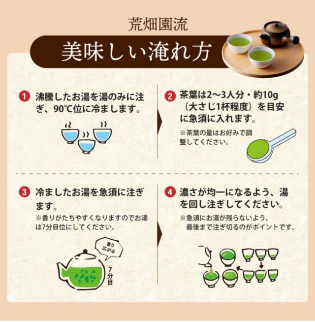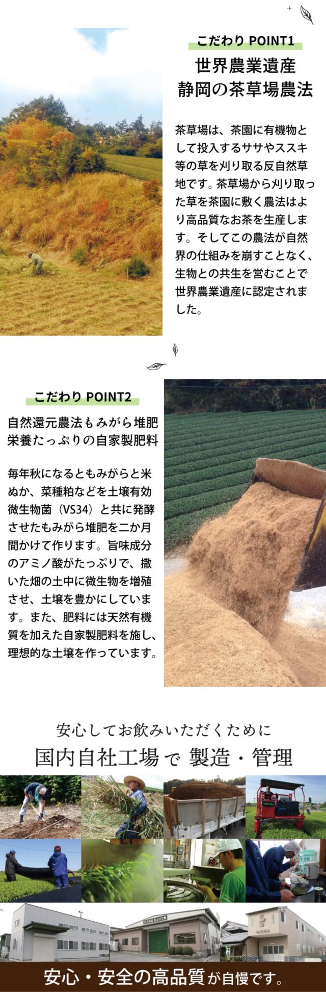 その葉を、通常の2〜3倍の時間をかけて葉の芯までしっかりと深く蒸すことにより、成分が分解され、タンニン(苦渋味)が減り、アミノ酸のテアニン(甘み)が増してまろやかで緑色の濃いお茶に出来上がります。