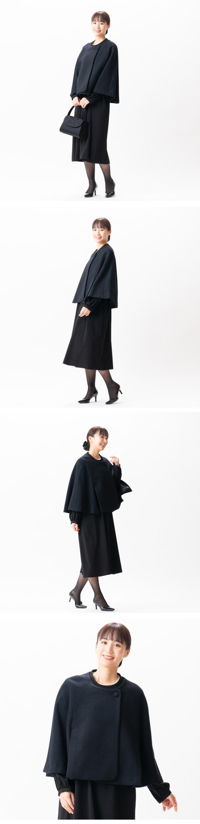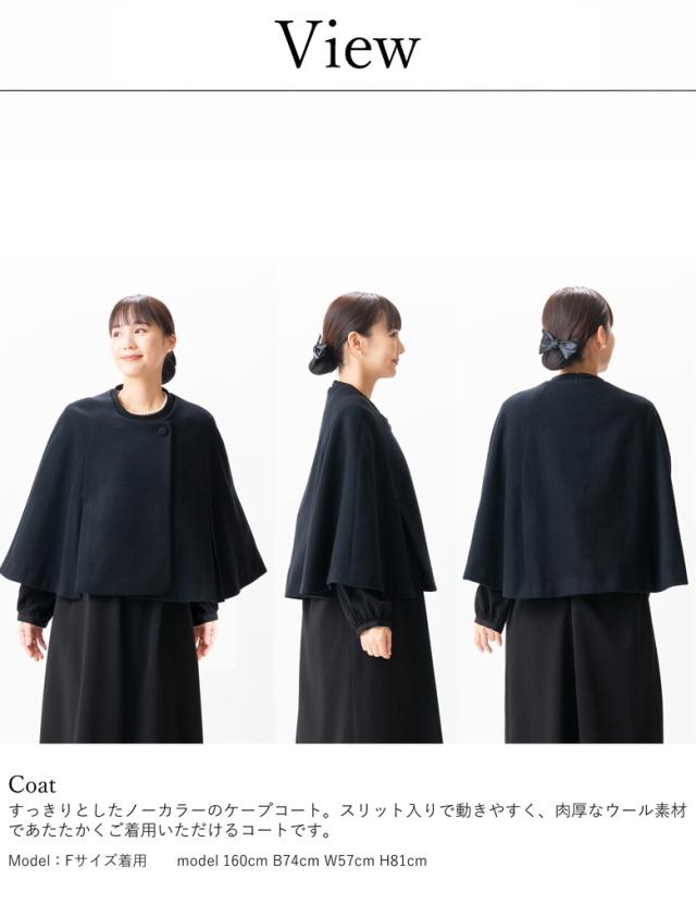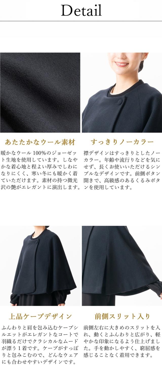 しなやかな肉厚のウール100%素材で着られるノーカラーケープ。着る人の年齢を選ばず上品なデザインで、さっと羽織るだけで下に着る洋服をきにしなくてよい。1着あると便利です。前側に入った大きめの2本のスリットが24cmの長さが軽やかで、窮屈感なく着られます。デザインから素材、縫製までこだわった完全国内生産の日本製ブラックフォーマルです。クラシカル エレガント 冬用 完全国内縫製 送料無料 弔事 慶事 礼装 20代 30代 40代 50代 60代 ミセスやママに最適な1着となります。