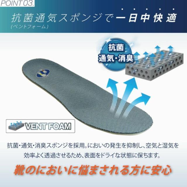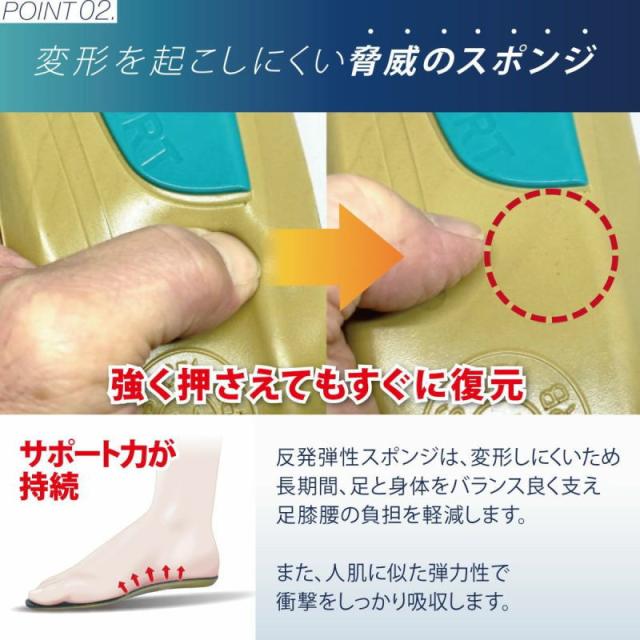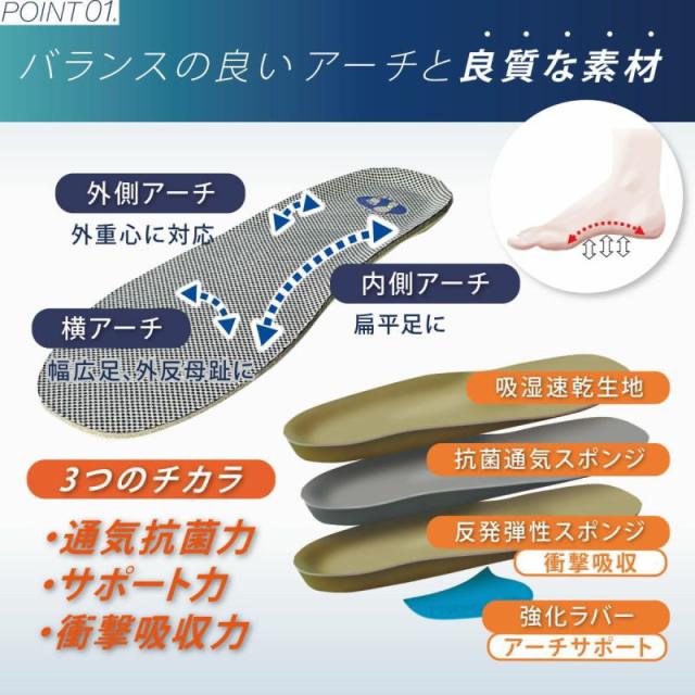 | 特徴 | 立ち仕事に最適な3つのアーチをバランス良くサポートし 日常生活、ウオーキング、長時間の立ち仕事などの 足腰膝の負担を軽減するインソールです。 反発弾性スポンジと抗菌・消臭で快適! ウォーキングや安全靴での労働にもおすすめです。 |