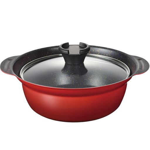 本体:アルミニウム合金、内面:ふっ素樹脂加工、外面:焼付け塗装、はり底:ステンレス鋼、ガラス蓋:強化ガラス