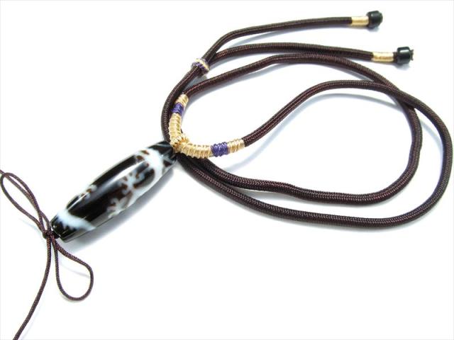 天珠・天然石が装着可能! 天珠用のデザイン紐が入荷しました! 組み紐で仕上げられており、先端部分は2本の細い紐(ひも)になっています。 そこに天珠や、天然石のビーズを通すことでネックレスとして使用することができます! 写真では天珠をひとつだけ通しておりますが、ビーズも合せて複数の石を通しても面白いですね。 ※通す穴は直径が1.5mm程度開いているとスムーズに通すことが出来ます。 サイズの調節ができるパーツが付いており、引っ張るだけでサイズ調節ができます! 石の付け替えも簡単ですので、手軽に天珠や天然石を入れ替えて楽しめる新しい商品です! デザインされた組みひもでこの価格!! 激安おすすめ商品です |