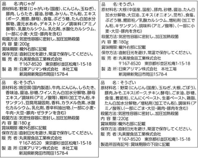 ■ レンジDELI 5種の具材入り肉じゃが 200g 豚バラ大根煮 180g すき焼き肉豆腐 180g 具だくさん豚汁 220g 4種 各3食 合計12食 |