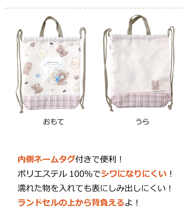 ![]() ![]() ![]() ![]() ![]() ![]() ![]() ・くまたろず たくさんのクマちゃんがかわいいナップサック。 折りたためるので修学旅行・林間学校のサブバッグとして等、あると便利なナップザックです。ランドセルの上から背負えます。 入園・入学準備にもおすすめです。