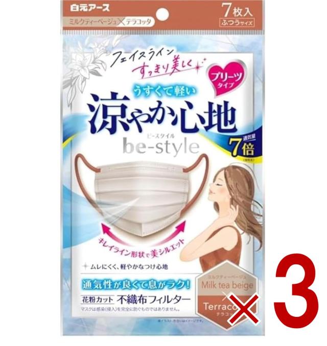 【23-29日限定 タイムセール】ビースタイル 涼やか心地 ミルクティーベージュ テラコッタ 7枚入 マスク 不織布 白元アース ビースタイル プリーツタイプ 花粉 3個