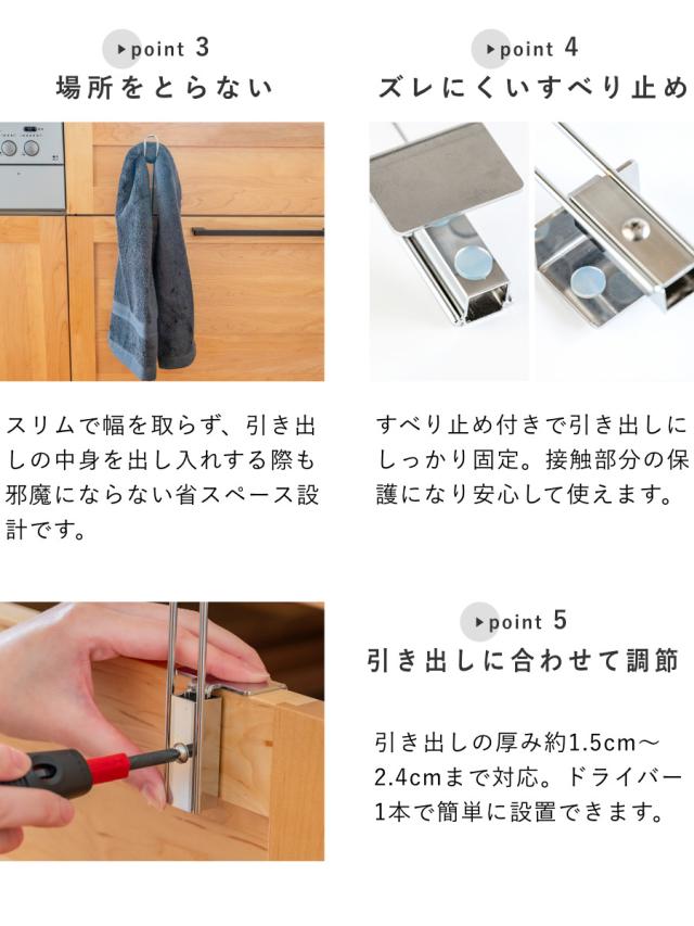 | 対応サイズ | 引き出しの厚み:約 1.5〜2.4cmまで |