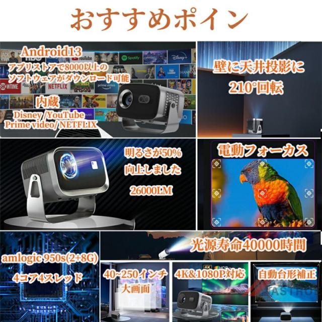 翌日発送 プロジェクター 家庭用 小型 天井投影 4K対応 電動フォーカス スマホと繋げる 26000LM高輝度 超高清 Netflix/YouTubeb 高画質 静音 自動台形補正 軽量 5G wifi6