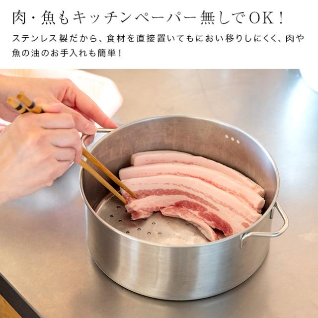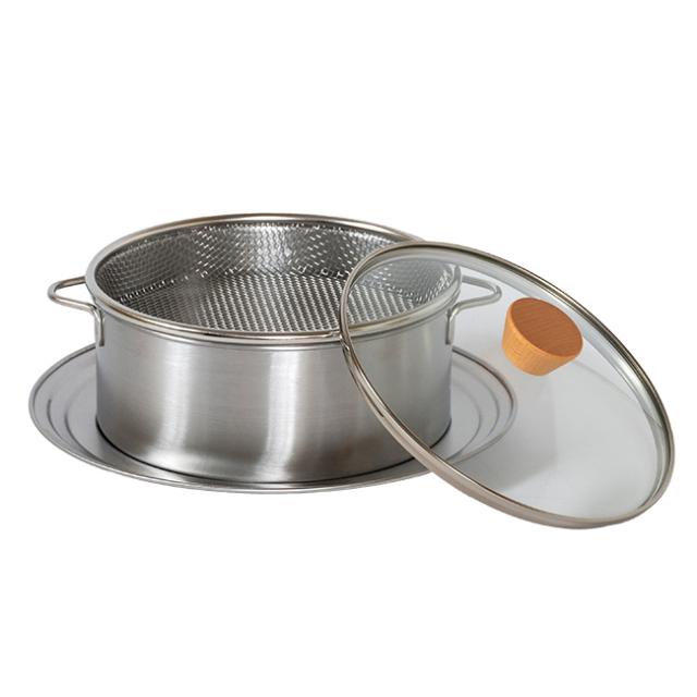 | 素材 | [本体・ざる・仕切り板]ステンレス鋼 [ガラス蓋]強化ガラス [つまみ]木、ウレタン塗装 |