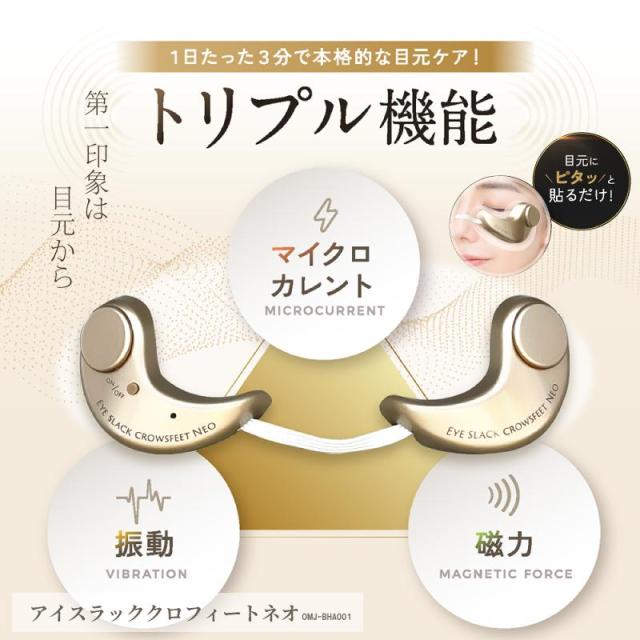 1 日3分貼り付けるだけ!お手入れの難しいデリケートな目元を集中ケア! 第一印象は目元で決まる! ●トリプル機能 ・マイクロカレント 目元の筋力や肌に刺激を与えて、明るいイキイキとした目元へ ・振動 心地よい刺激を与えて、目元をリフレッシュ ・磁力 じんわりお肌と筋力に優しく働きかける どんよりしがちな目元の流れをスムーズにしてすっきり! ●3つのモード MODE1:リフトモード弱 ・マイクロカレント弱 ・可変振動 ・磁力 お肌をソフトに刺激する複合波形のマイクロカレント弱+可変振動+磁力によるケア MODE2:リフトモード強 ・マイクロカレント強 ・リズミカルなタッピング振動振動 ・磁力 お肌をソフトに刺激する複合波形のマイクロカレント強+リズミカルなタッピング振動+磁力によるケア MODE3:リフレッシュモード ・パワフル振動 ・磁力 パワフル振動+磁力で滞りがちな、どんより目元の流れをスッキリとした目元にリフレッシュ! リフトモードのマイクロカレントは 電気刺激が苦手な方でも低刺激で安心! ●お肌に刺激を優しく伝える粘着パッド 目元にしっかりと貼り付きマイクロカレントの刺激をお肌に優しく効率よく伝える粘着パッド。重さを感じにくい軽量設計だから快適な使い心地。 粘着パッドはワンタッチで取り付け出来るホック式 JANコード 【OMJ-BHA001】:4560133832948 サイズ・容量 本体サイズ:約190×50×25 本体重量:約30g 規格 ■生産地:【本体】日本【粘着パッド】中国 ■素材・成分:【本体】ABS 樹脂、その他 【粘着パッド】ポリエチレン、グルコース、その他 【仕様】 使用電池:リチウム電池(CR2032)×2 セット内容 本体、粘着パッド×2組、リチウム電池CR2032( 動作テスト用)×2