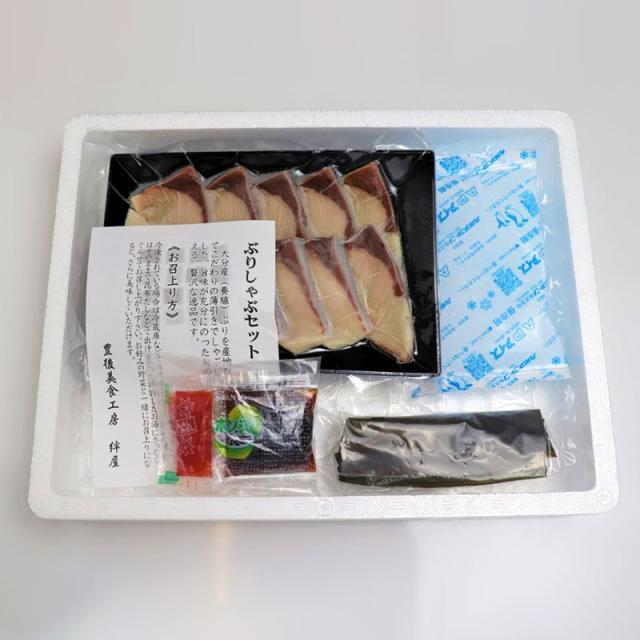 大分県産の新鮮なぶりをしゃぶしゃぶ用にセットしました。昆布で出汁をとった出し汁にしゃぶしゃぶしてお楽しみ下さい。