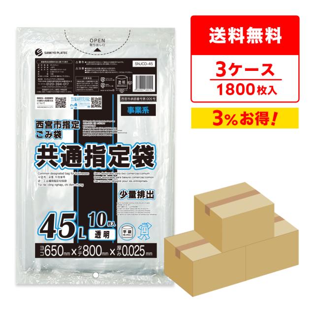 西宮市指定事業系ごみ袋 少量排出 共通指定袋 45リットル 透明 65x80cm 0.030mm厚 10枚x60冊x3箱 SNJCD-45-3 ゴミ袋 ポリ袋 ビニール袋 西宮市 指定袋 事業用 資源ごみ クリア サンキョウプラテック