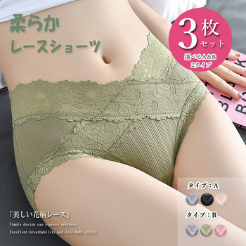 柔らかい綿混素材にフェミニンな花柄レースをあしらったサラサラと快適な穿き心地のショーツ3枚組