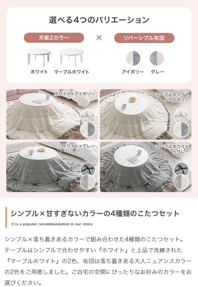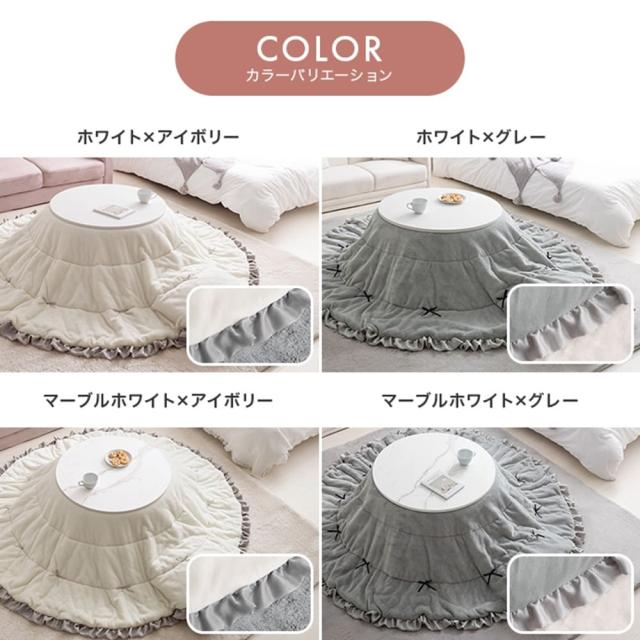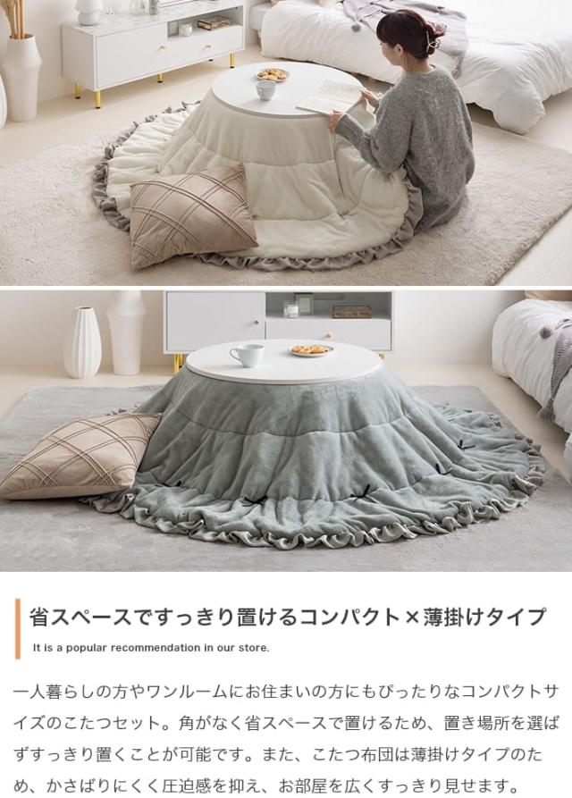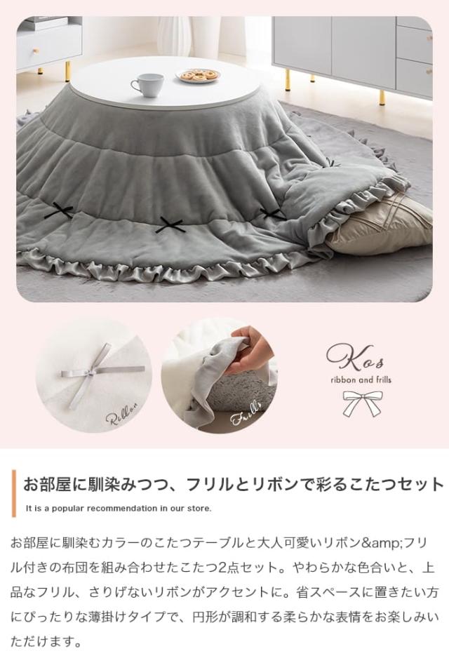 円形天板68cmのこたつと、リボンとフリルが可愛い掛け布団を組み合わせた2点セットです。