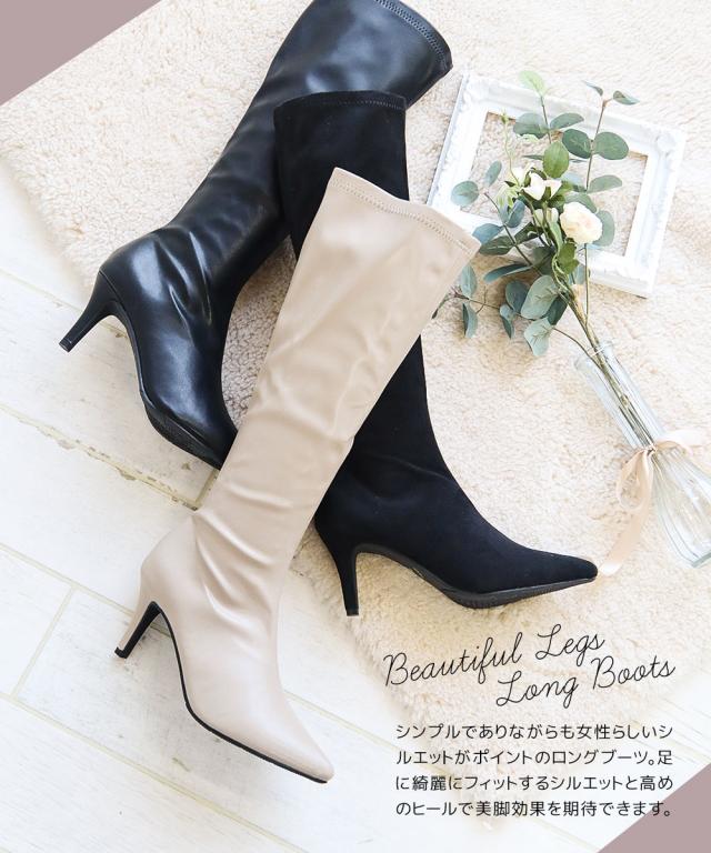 脚をすっと美しく見せるストレッチ素材を使用した、シンプルで洗練されたロングブーツ。