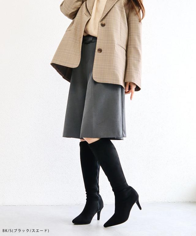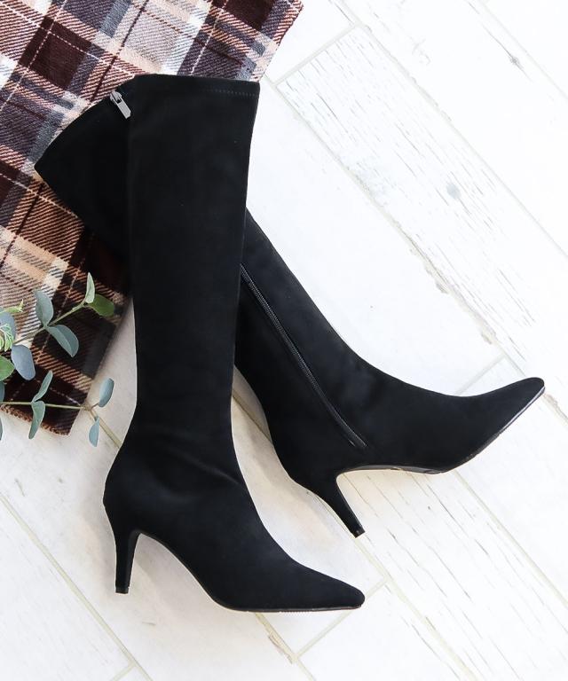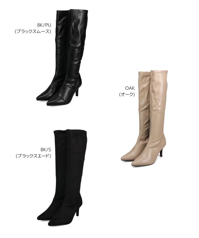 ストレッチ ピンヒール ロングブーツ レディース 美脚 細見え ポインテッドトゥ 7.5cmヒール きれいめ シンプル 大人 上品 サイドファスナー 防滑 歩きやすい 通勤 オフィス デート 秋冬 ブラック スエード スムース オーク 6786