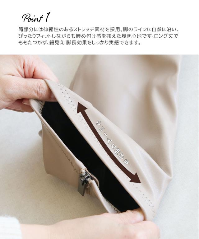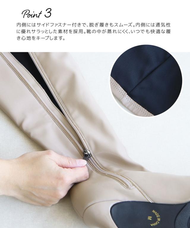 内側にはサイドファスナー付きで、ロングブーツ特有の着脱のストレスを軽減。