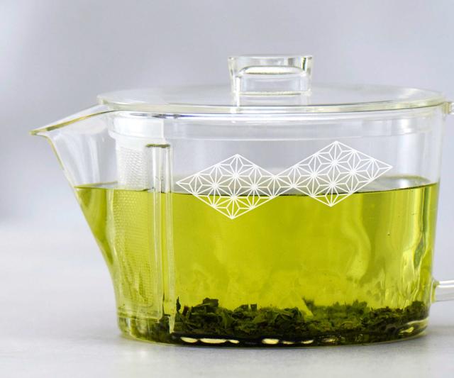 日本の伝統模様でもある「麻の葉」を施しました。麻の葉は成長や繁栄を象徴し、古くから愛されてきたデザインです。浮かび上がるように麻の葉が映え、お茶の美しい色合いとの調和を愉しめます。