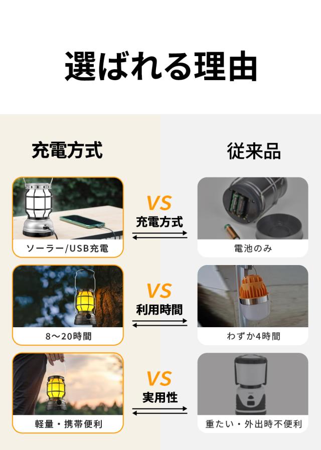 ●USB充電式:マイクロUSB充電ポートを搭載し、PC、モバイルバッテリーなどUSB出力口付きの機器から簡単にランタンに充電できます。