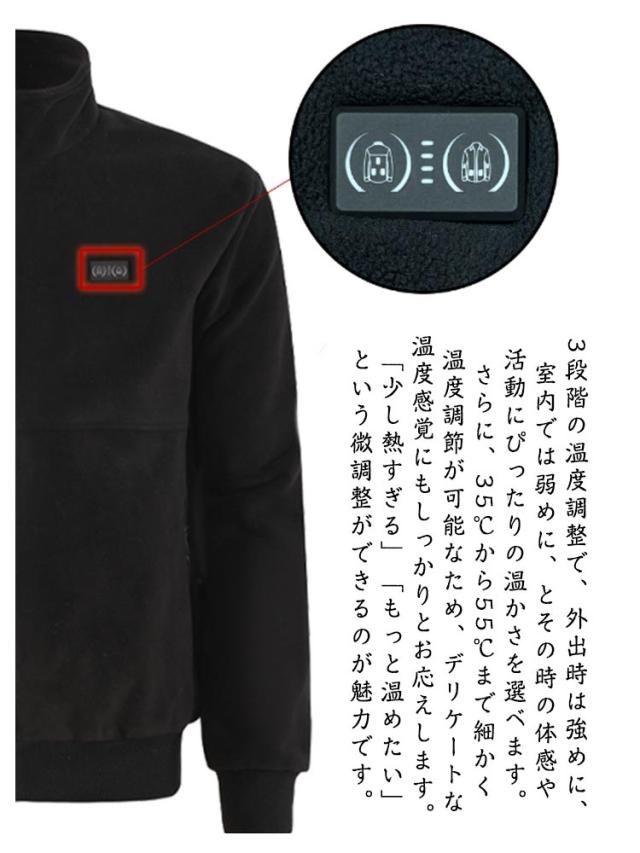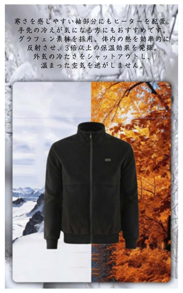 | 【グラフェン保温】電熱ジャケット S-6XL 大きいサイズ 8箇所発熱 ボアジャケット 「8箇所発熱 速暖」で、寒がりな人もすぐに温まる 首元、背中、お腹、そして袖まで、全身の要所を8箇所で集中的に温めます。従来の防寒着のように「着込んでじわじわ温まる」のを待つ必要はありません。でお困りの方も、すぐに心地よい温もりを体感できます。 「3段階温度制御&35〜55℃調整」で、シーンに合わせた細やかな温もり調節 3段階の温度調整で、外出時は強めに、室内では弱めに、とその時の体感や活動にぴったりの温かさを選べます。さらに、35℃から55℃まで細かく温度調節が可能なため、デリケートな温度感覚にもしっかりとお応えします。「少し熱すぎる」「もっと温めたい」という微調整ができるのが魅力です。 「袖まで温まる+グラフェン保温」で、冷えから徹底ガード 寒さを感じやすい袖部分にもヒーターを配置。手先の冷えが気になる方にもおすすめです。グラフェン素材を採用。体内の熱を効率的に反射させ、3倍以上の保温効果を発揮。外気の冷たさをシャットアウトし、温まった空気を逃がしません。 「男女兼用デザイン」で、すっきり見えるおしゃれな防寒着 男女兼用のシンプルでスタイリッシュなデザインは、どんなコーディネートにもなじみます。機能を感じさせない隠しボタンと、寒さの侵入を防ぐハイネックが、着ている人をすっきりと見せるおしゃれさにこだわりました。アウトドアはもちろん、通勤や街歩き、そして屋内でのちょっとした防寒としても違和感がありません。 | |