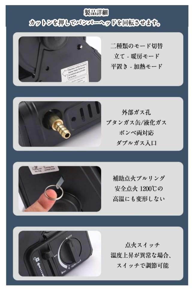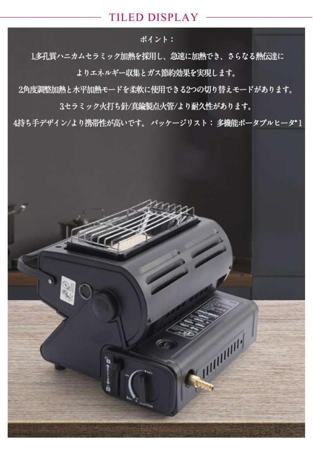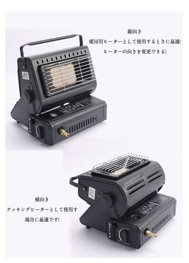 | ガスストーブ 電源不要 速暖 持ち運び簡単 1台2役 ポイント: 1.多孔質ハニカムセラミック加熱を採用し、急速に加熱でき、さらなる熱伝達によりエネルギー収集とガス節約効果を実現します。 2.角度調整加熱と水平加熱モードを柔軟に使用できる2つの切り替えモードがあります。 3.セラミック火打ち針/真鍮製点火管/より耐久性があります。 4.持ち手デザイン/より携帯性が高いです。 パッケージリスト: 多機能ポータブルヒータ* 1 さまざまなシーンで使えます *ガスボンベは付属しておりません。 キャンプに便利な多機能ストーブ 暖房用としてはもちろん、お湯を沸かしたりちょっとした調理もできるのでキャンプなどのアウトドアに必須なアイテム! 縦向き 暖房用ヒーターとして使用するときに最適! ヒーターの向きを変更できる! 横向き クッキングヒーターとして使用する場合に最適です! 市販のガスボンベも使用可能です!! 220gまたは250gのブタンガス、カートリッジLPG(液化ブタン)のガスカートリッジを使用することが出来ます。 製品詳細 カットンを押してバンパーヘッドを回転させます。 二種類のモード切替 立て - 暖房モード 平置き - 加熱モード 外部ガス孔 ブタンガス缶/液化ガス ボンベ両対応 ダブルガス入口 補助点火プルリング 安全点火 1200℃の高温にも変形しない 点火スイッチ 温度上昇が異常な場合、スイッチで調節可能 | |