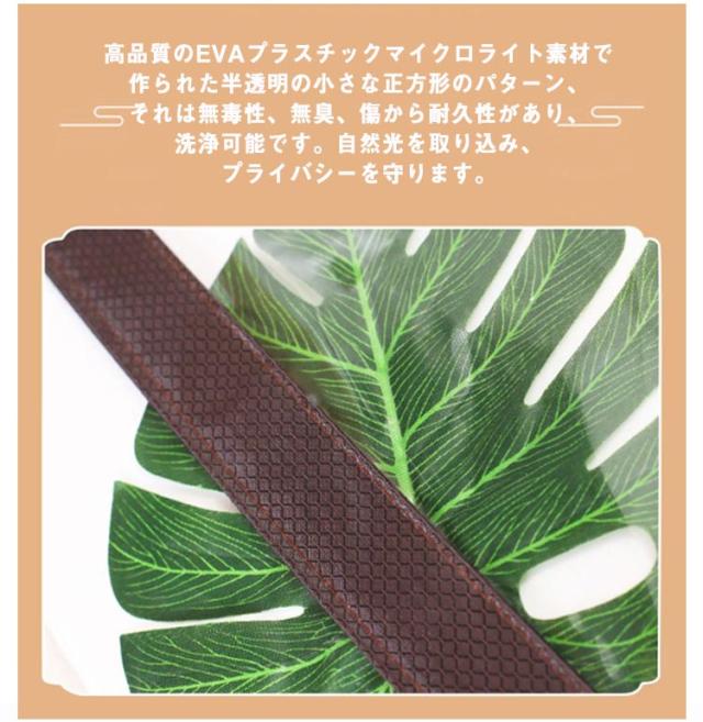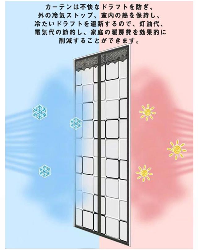 | 冷気ストップ暖房効果UP省エネ:カーテンは不快なドラフトを防ぎ、外の冷気ストップ、室内の熱を保持し、冷たいドラフトを遮断するので、灯油代、電気代の節約し、家庭の暖房費を効果的に削減することができます。 環境に優しい素材:高品質のEVAプラスチックマイクロライト素材で作られた半透明の小さな正方形のパターン、それは無毒性、無臭、傷から耐久性があり、洗浄可能です。自然光を取り込み、プライバシーを守ります。 簡単なインストール:数分で取り付けることができ、工具や棒は必要ありません。 広く用途:内部/外部ドアの窓、キッチンドア、エアコン付きの部屋、メインエントランスドア、オフィス、店舗、パティオ、飛沫感染・飛沫防止・感染防止に間仕切りとしても使用できます。 | |
