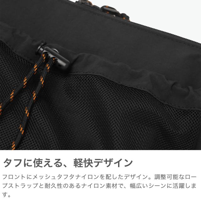 軽量ながら十分な収納力を備えたショルダーバッグ。フロントのメッシュポケットにより、小物の出し入れもスムーズに行えます。太めのオリジナルザイルショルダーは長さ調整が可能で、ブランドらしい存在感をプラス。耐久性に優れたナイロン素材を使用し、デイリーからアウトドアまで幅広いシーンで活躍します。シンプルな中に機能性を兼ね備えた、実用的なアイテムです。