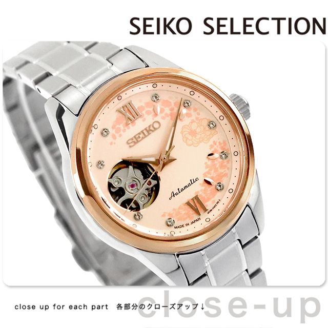 正規品 7年保証キャンペーン 送料無料 セイコーセレクション 数量限定 日本製 自動巻き レディース 腕時計 SSDE024 SEIKO SELECTION 2026 SAKURA Blooming Limited Edition アナログ ピンク ◆水面に映る桜の美しさ、“逆さ桜”をテーマにしたモデルが登場。シンプルなオープンハートにダイヤルのカラーとデザインが調和するデザイン。桜の花びらをイメージしたインデックスと、サーモンがかった優しいダイヤルカラーが調和する、特別なペアモデルです。咲き誇る八重桜をダイヤル上部に、水面に映る桜をモザイク調にしてダイヤル下部にデザインしました。煌めくクリスタルが手元に華やぎを添えます。 発売日:2026年1月発売 機械式腕時計