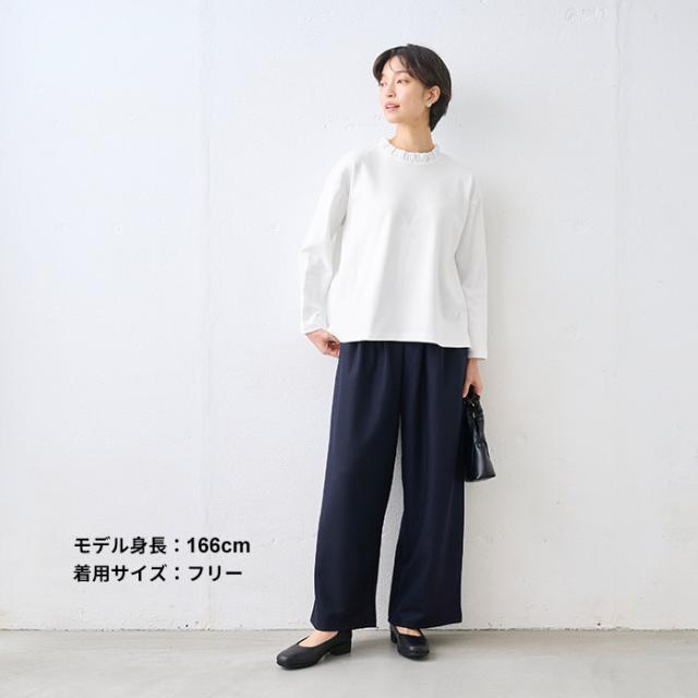 ゆったりとしたドロップショルダーと体のラインを拾いにくいシルエットで、デイリーにも快適。ジャケットやワンピース、ジャンパースカートのインナーとしても使いやすく、オフィスやフォーマル、入学式・卒業式などのセレモニーシーンにも活躍します。きれいめにもカジュアルにも合わせやすく、40代・50代の大人の女性におすすめのレディーストップスです。