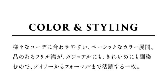 コットン100%のやさしい着心地が魅力の、フリル襟カットソープルオーバー。身生地には、なめらかで程よい厚みのあるコーマ糸スムース生地を使用し、一枚でも透けにくく安心感のある着心地です。襟元は軽やかな綿ローン生地に切り替えたフリル襟デザインで、顔まわりを上品に演出します。