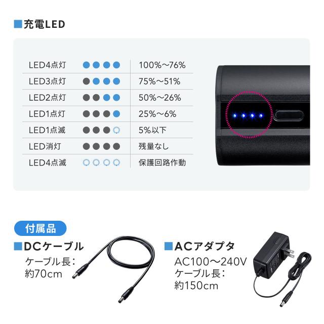 ●電池残量がわかる4つのLEDがついており、現在の状況を確認できます。