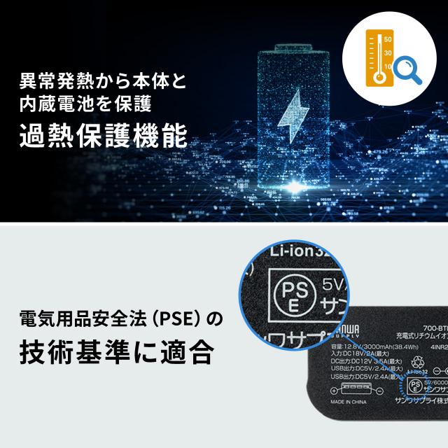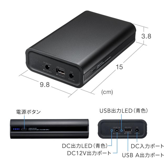 DC12V機器用モバイルバッテリー リン酸鉄リチウムイオン電池 PSE適合品 12000mAh 38.4Wh 低電力機器対応 飛行機内持ち込み可[700-BTL059]